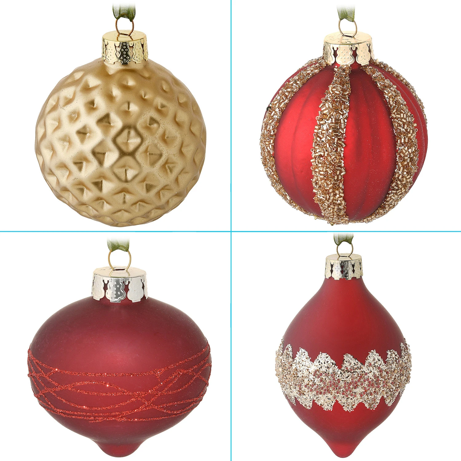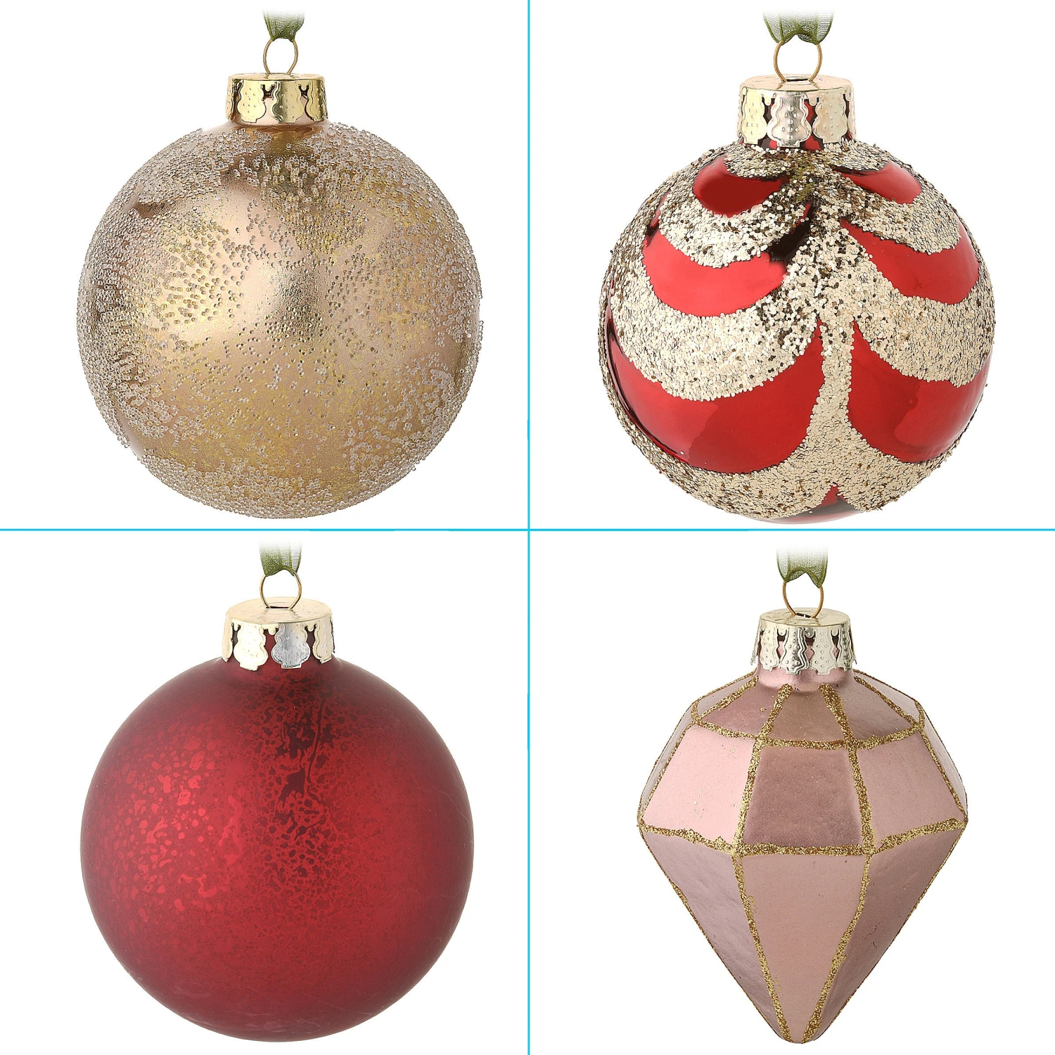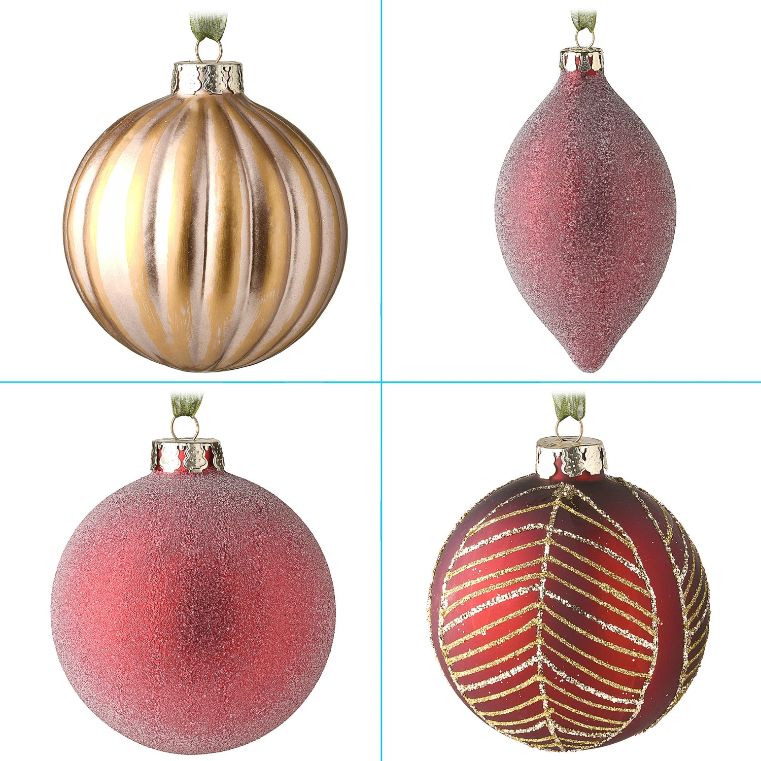 This set of 20 vintage-style blown glass ornaments feature a motif of attractive gold and burgundy colors in both gloss and matte finishes. Included are ball, teardrop, and ornate shapes many with decorative and glittered embellishments. Each ornament includes a ribbon loop for hanging convenience. Boxed in white heavyweight cardboard with cushioned compartments, these beautiful ornaments will become a part of your holiday decorating for years to come.