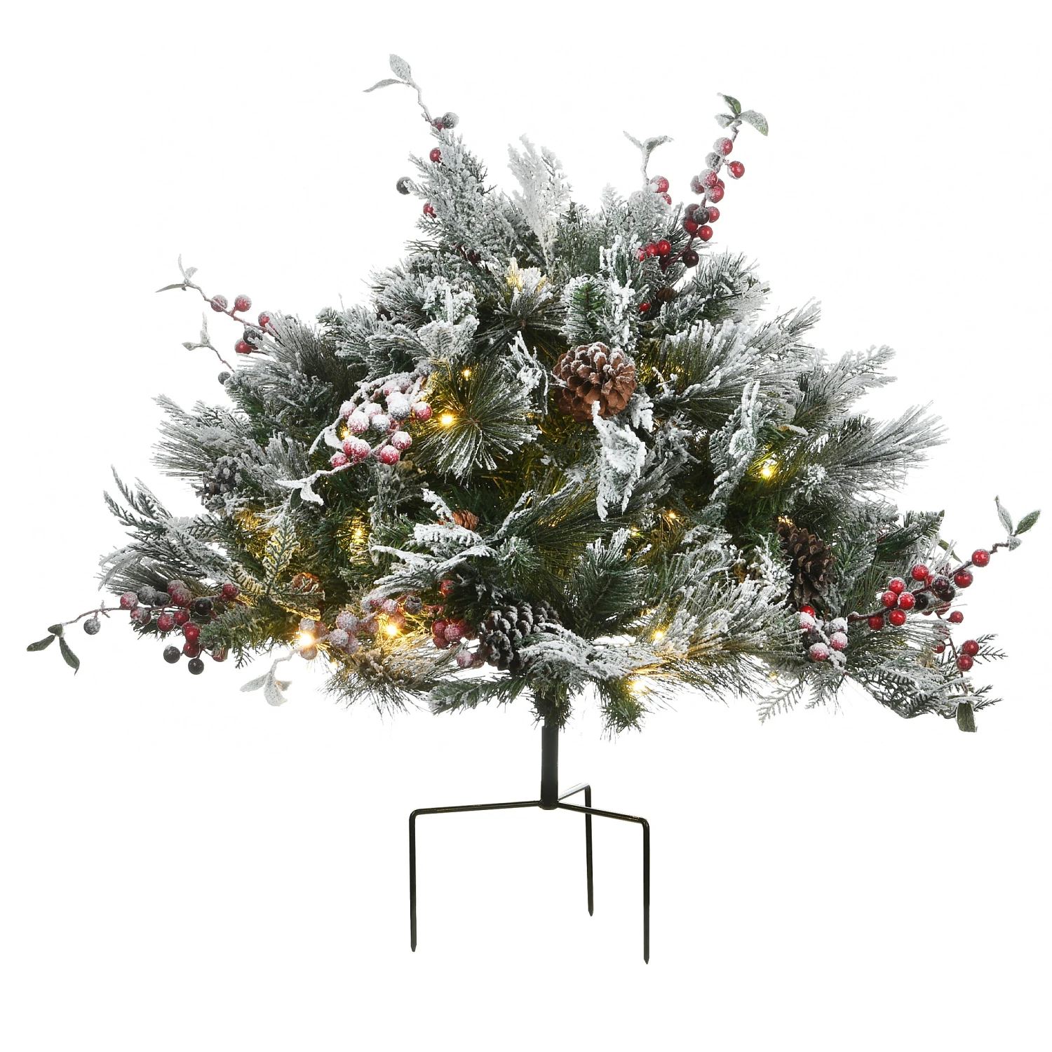 Designed for filling decorative urns and pots, this spray of snow-covered evergreen and bristle branches is trimmed with pine cones and red berries. It is pre-lit with 50 battery-operated warm white LED lights that are energy-efficient and long lasting. 6 hours ON/18 hours OFF timed operation. Included is a 3-prong metal stake for propping up the filler in an empty container or for inserting into soil. For indoor or covered outdoor display.