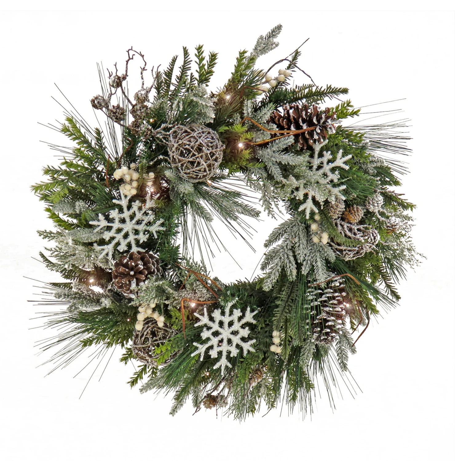 This wreath features a mixture of evergreen, bristle, and cedar branch tips trimmed with pinecones and berry clusters. It is decorated with glittered snowflakes and twig ball ornaments that add a festive flavor. It is pre-strung with 30 battery-operated warm white LED lights that are energy-efficient and long lasting. 6 hours ON/18 hours OFF timed operation. This wreath can be displayed on door, wall, or window in indoor or covered outdoor locations.