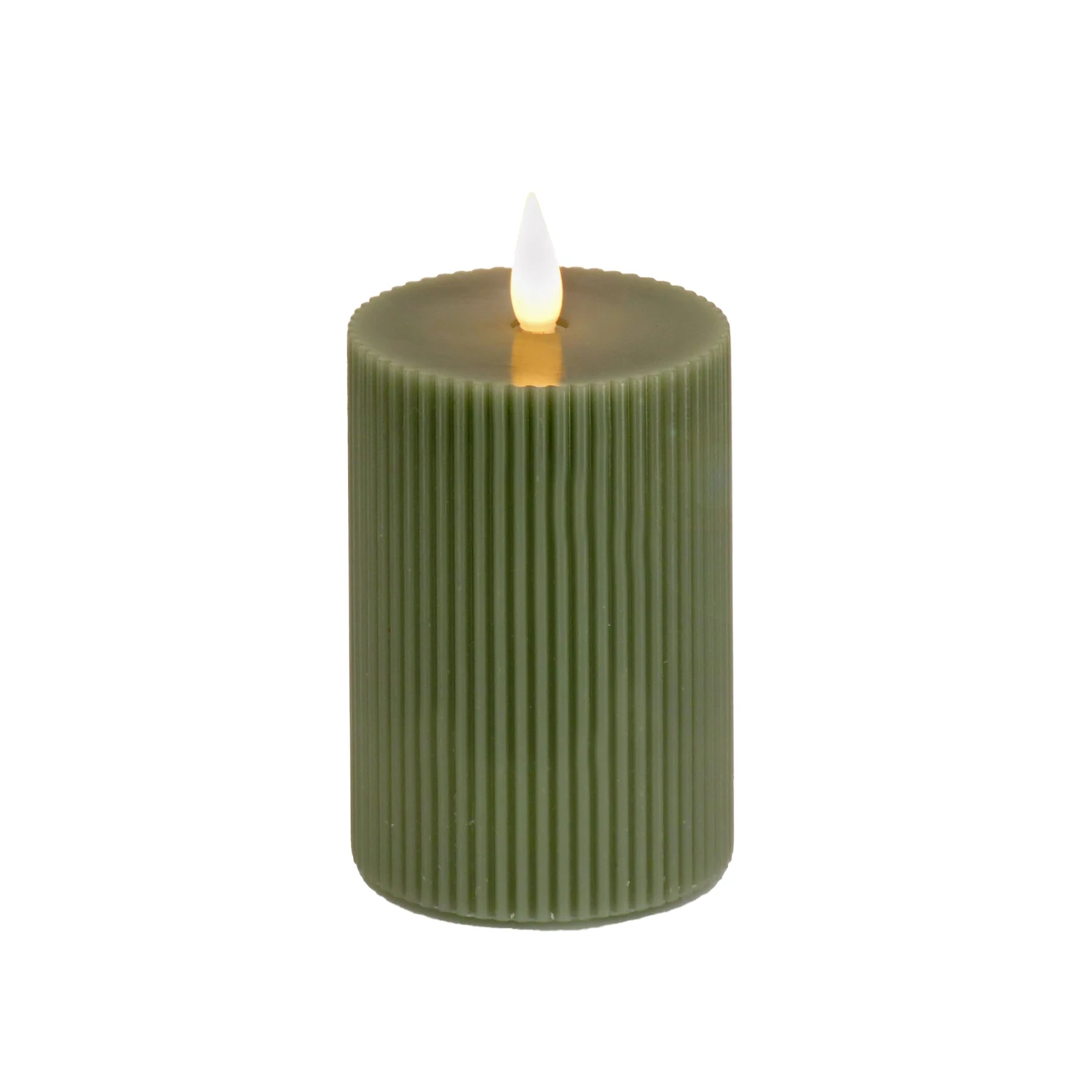Battery operated with remote controlled functions, this flameless candle produces a realistic, soft, and safe candle glow. The exterior surface is crafted with real wax and features an elegant vertical ridged design in an attractive dark green finish. A handheld remote control operates the lifelike candle flame with functions that include brightness, flicker speed, and timer settings. Uses two C size batteries (not included).