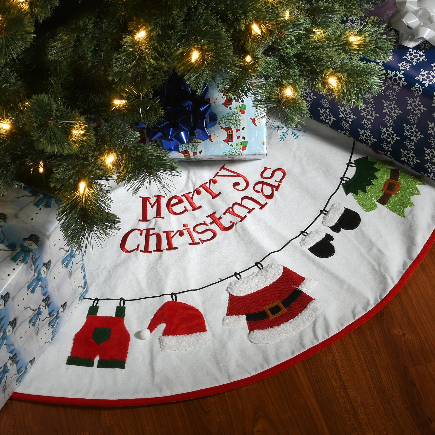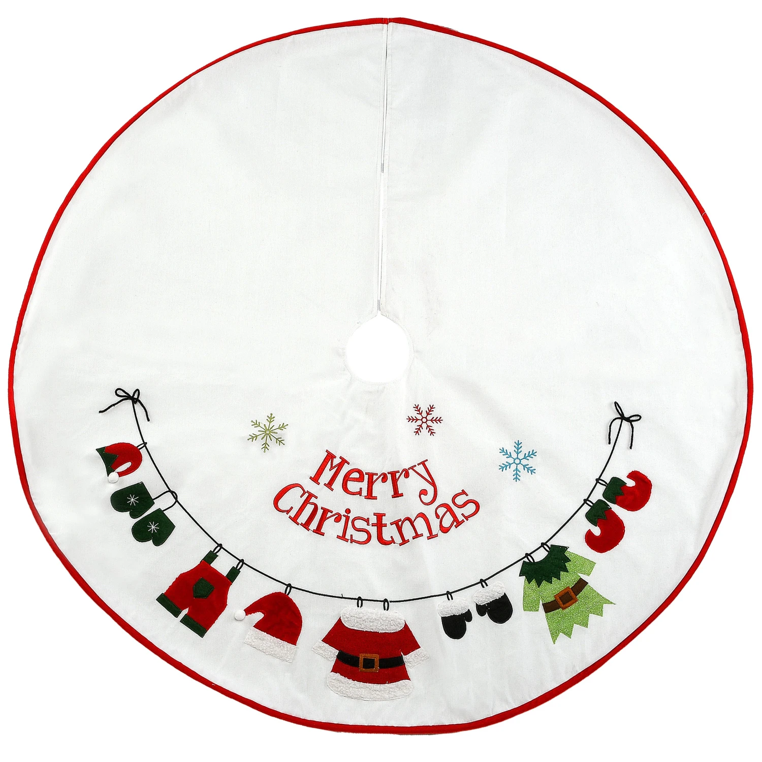 Surrounding the base of your trimmed tree with an attractive skirt will add the finishing holiday touch. Made of 100% polyester, this bright white skirt has a fun design that shows the clothing of Santa and an elf drying on a clothesline with the words “Merry Christmas” right above. The split seam design allows for easy placement with Velcro tabs included to close and secure the seam.