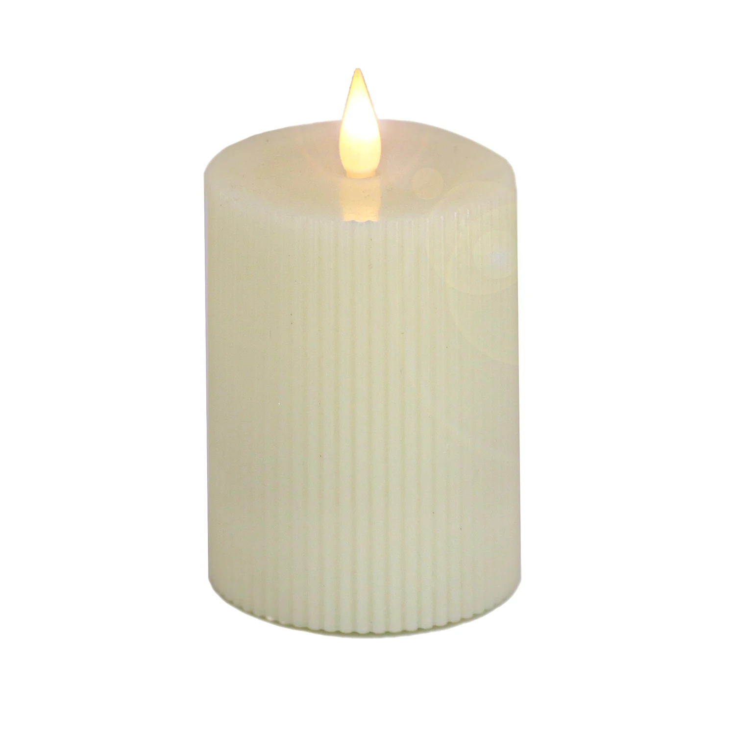 Battery operated with remote controlled functions, this flameless candle produces a realistic, soft, and safe candle glow. The exterior surface is crafted with real wax and features an elegant vertical ridged design in an attractive ivory finish. A handheld remote control operates the lifelike candle flame with functions that include brightness, flicker speed, and timer settings. Uses two C size batteries (not included).