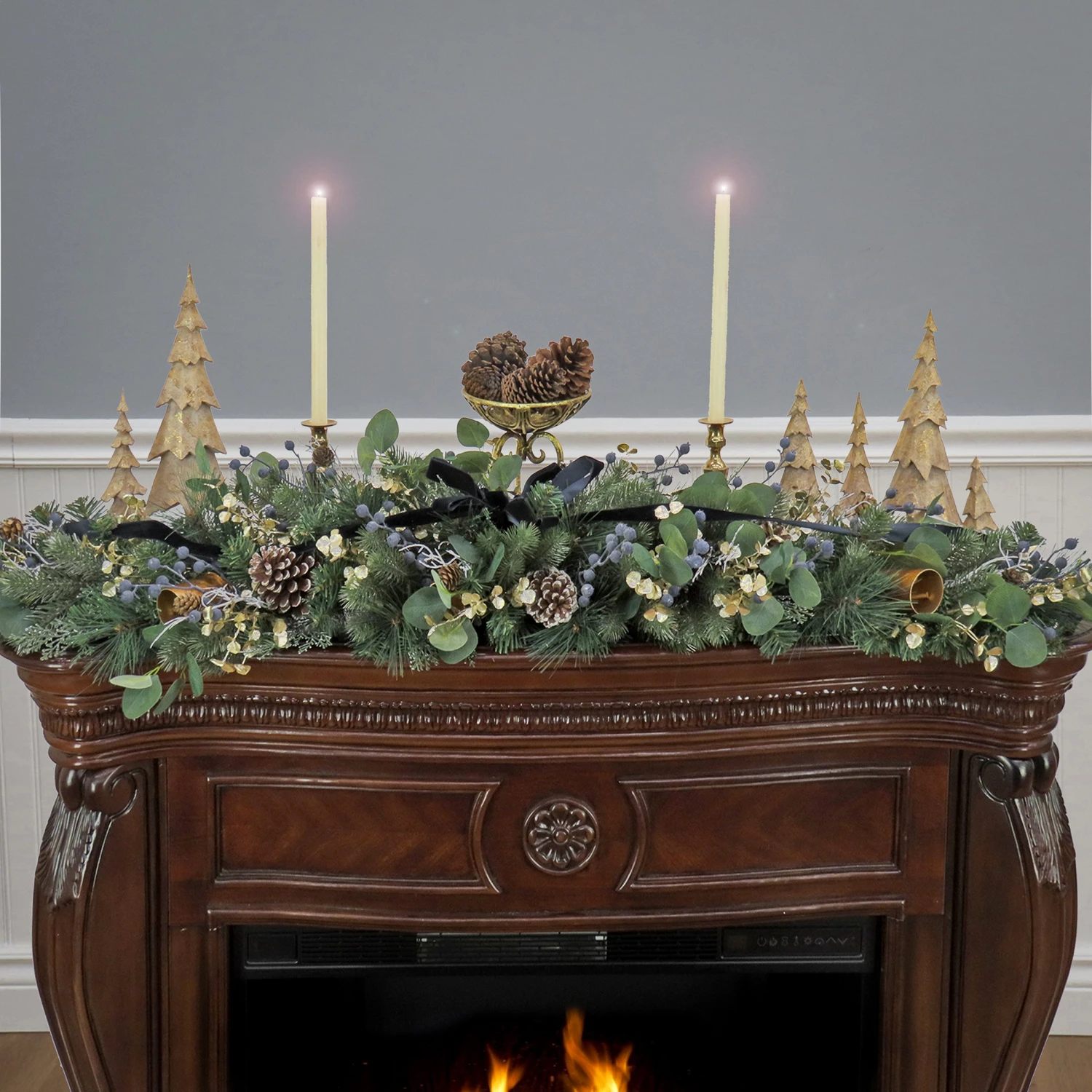 This Swiss Chic decorated mantle swag features a mixture of evergreen and bristle branch tips tightly grouped together to form this holiday décor piece. It is trimmed with pinecones, leafy greens, white twigs, clusters of blue berries and gold metal bells. A black velvet ribbon and bow add the finishing touch. Display this festive swag over a fireplace mantle or on a tabletop. For indoor use only.