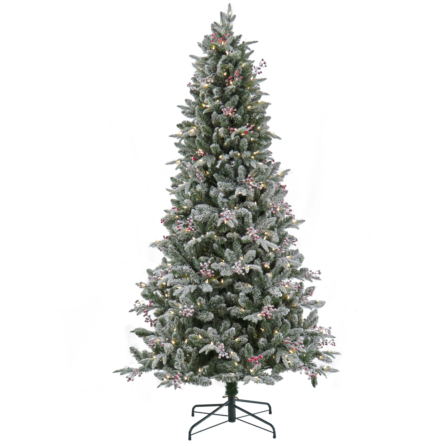 The Snowy Poechmann Fir tree features Feel Realยฎ branch tip technology, creating a tree with remarkable realism. These crush-resistant branch tips are molded from real tree branches for an authentic living tree appearance. This tree is trimmed with red berries and dusted with the look of freshly fallen snow. It also offers a slim profile making it a great choice for display in corners or rooms with limited floor space. It is pre-strung with 400 warm white LED lights that are long lasting and energy efficient. This three-section tree is designed with hinged branches for ease of assembly. Sturdy folding metal tree stand is included.
