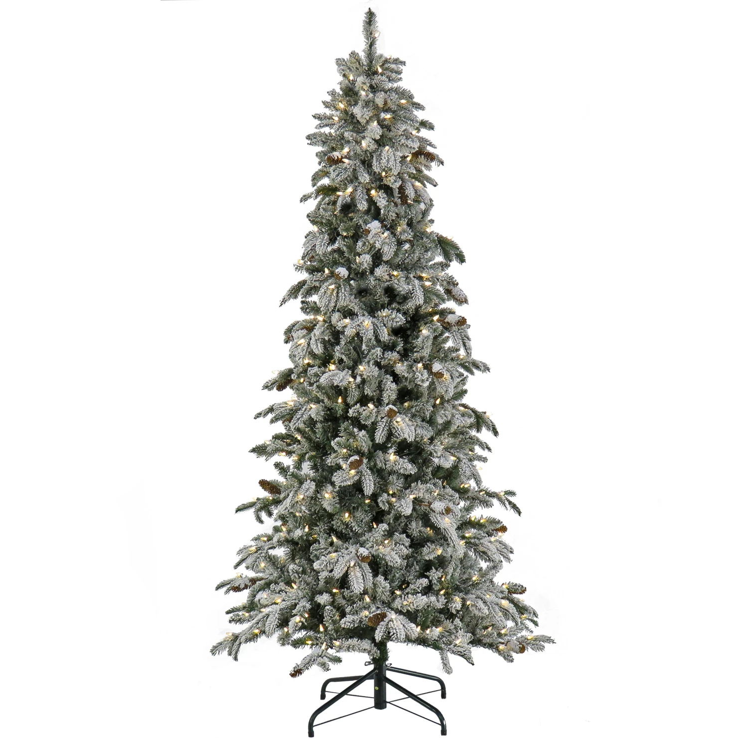 The Snowy Vintin Fir tree features Feel Realยฎ branch tip technology, creating a tree with remarkable realism. These crush-resistant branch tips are molded from real tree branches for an authentic living tree appearance. This tree is trimmed with pinecones and dusted with the look of freshly fallen snow. It also offers a slim profile making it a great choice for display in corners or rooms with limited floor space. It is pre-strung with 400 warm white LED lights that are long lasting and energy efficient. This three-section tree is designed with hinged branches for ease of assembly. Sturdy folding metal tree stand is included.
