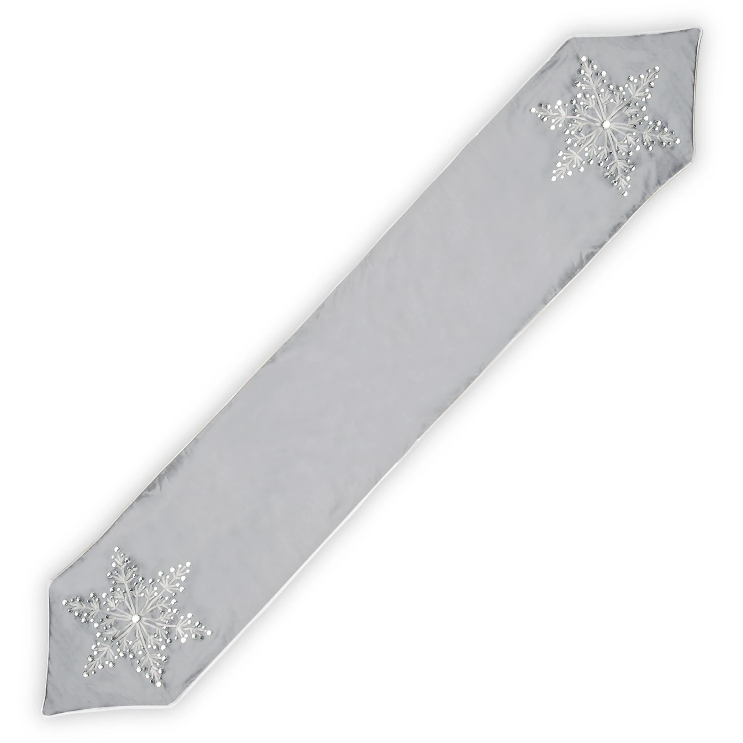 This attractive and durable table runner is constructed of 100% polyester fabric. The design motif features a large white embroidered snowflake at each end. Dress up your holiday table setting with this decorative holiday accent piece.
