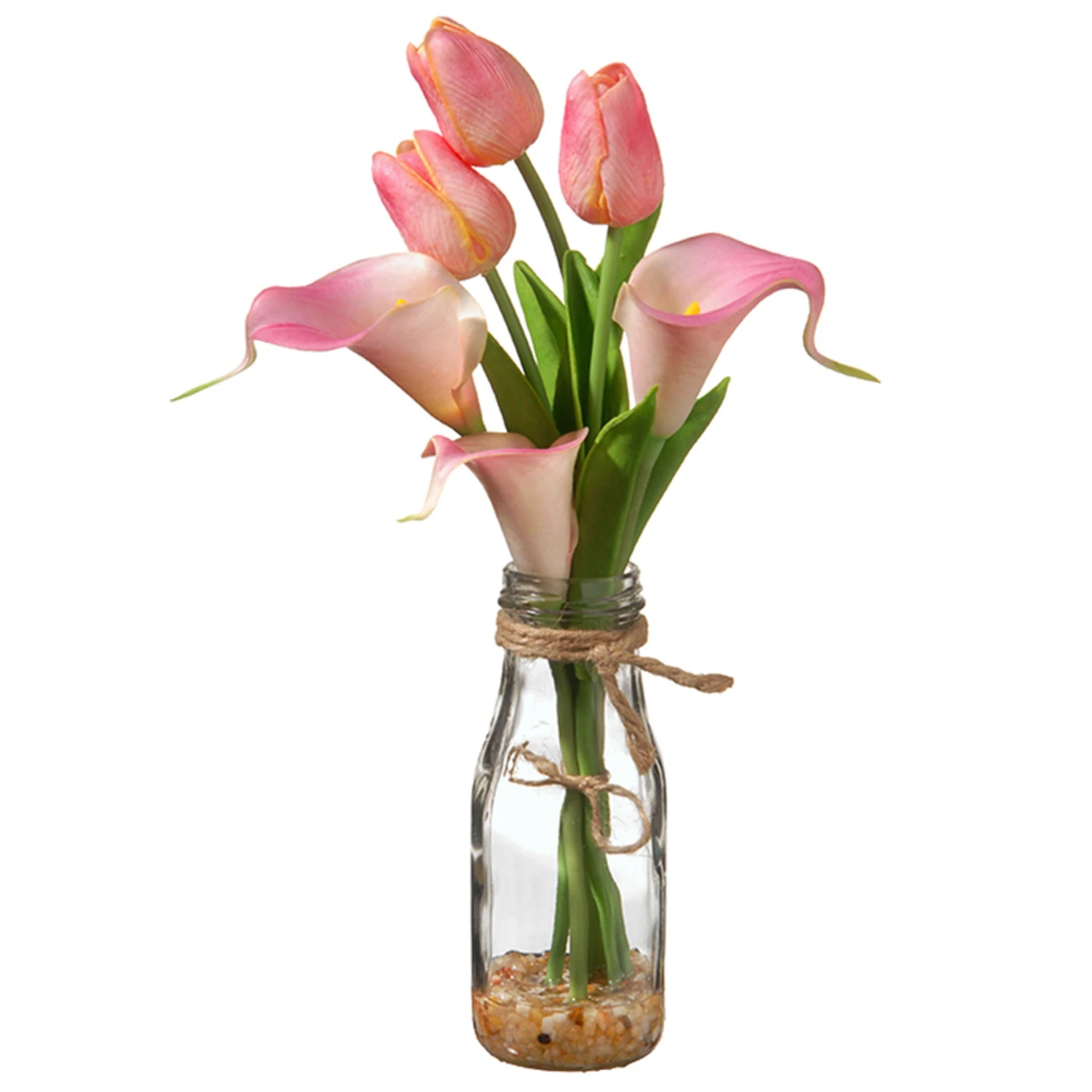 - Includes one Artificial Flower Bouquet in Glass Vase that measures 12 inches in height, is filled with large, pink tulips and includes sprigs, leaves and stems in a charming glass vase with a pebble base.
