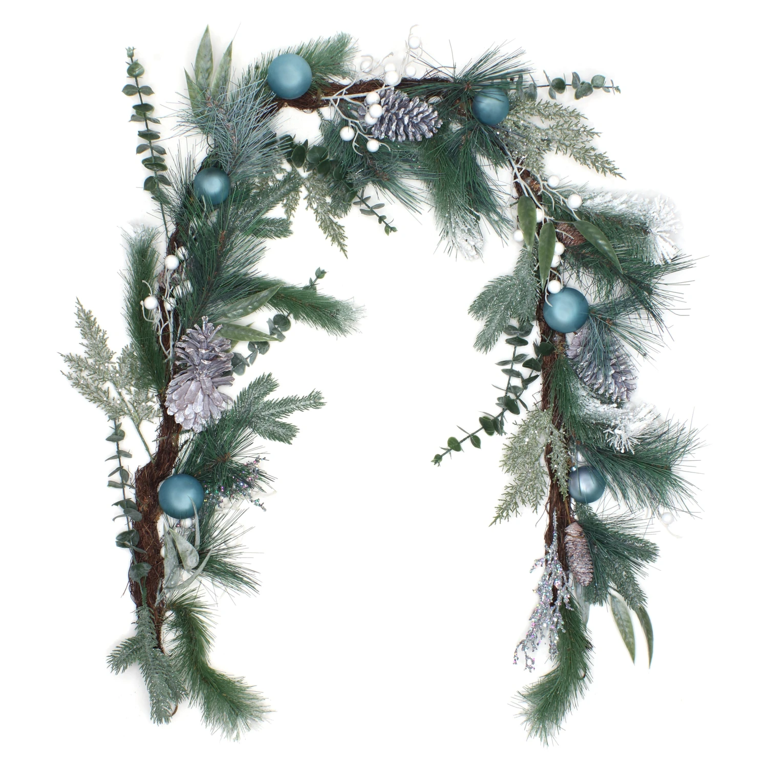 This Christmas garland features a blend of vibrant green branch tips giving a full bodied appearance and is decorated with blue ball ornaments and leafy greens along a Evergreen base. Designed with a flexible vine, this garland offers a mixture of evergr