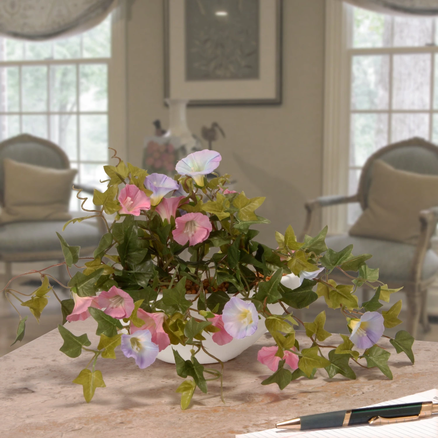 - This spectacularly spring decoration is the perfect complement to any decorative arrangement, featuring pink and blue flower blooms, leafy greens and ivy vines.
