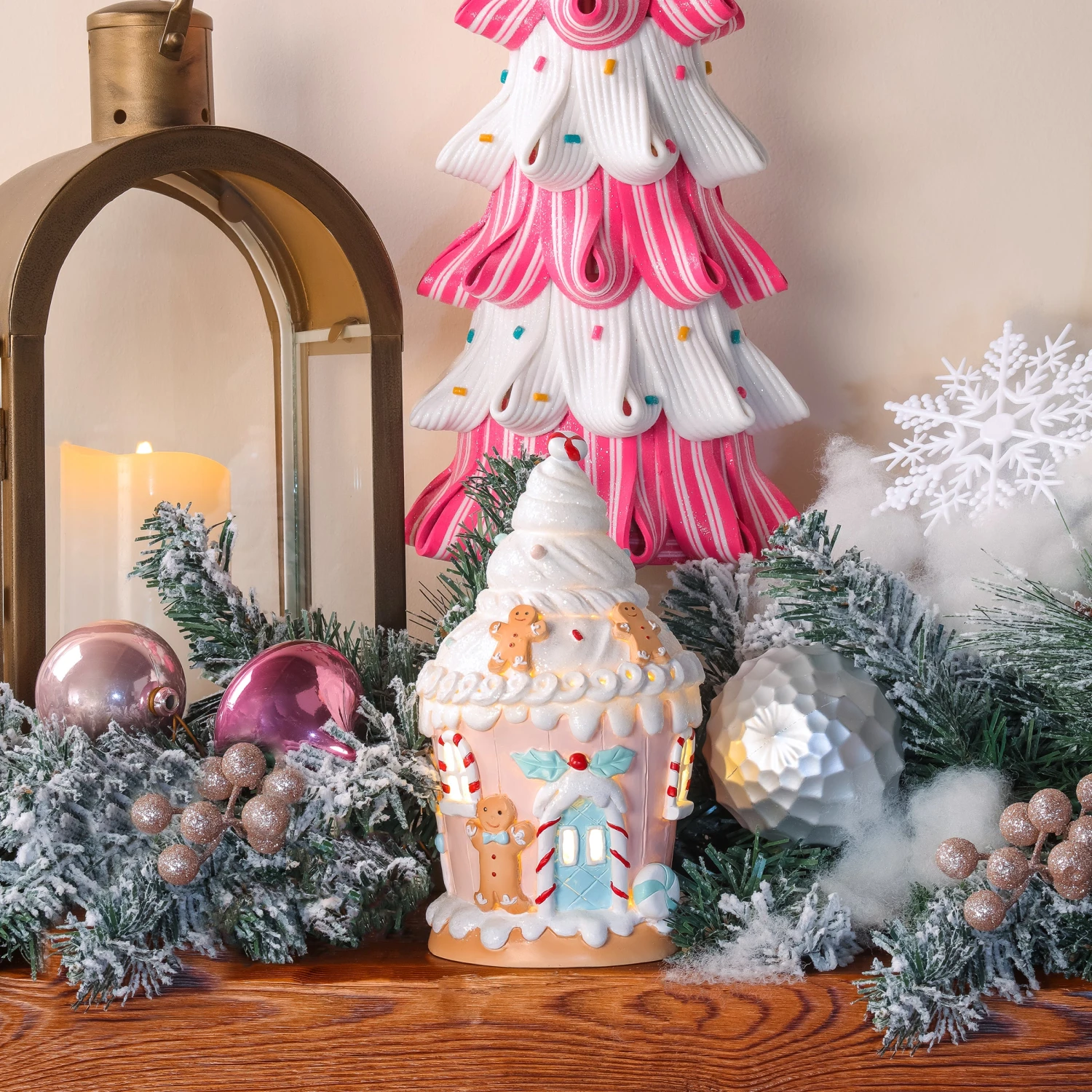 Designed with delicious detail, this candy and icing topped cupcake is designed as a little gingerbread man house with the occupant standing outside the door. It is constructed with a combination of durable stone powder and poly resin materials in soft pa