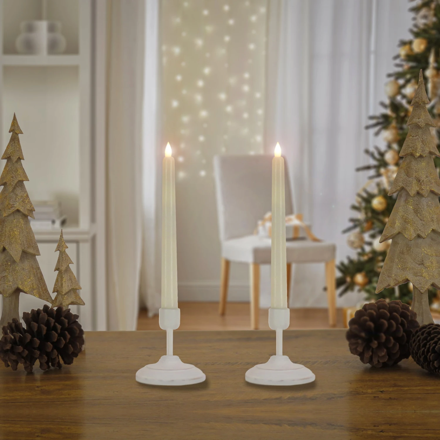 Battery operated with remote controlled functions, these two flameless candles produce a realistic, soft, and safe candle glow. The smooth, ivory color candle surfaces are crafted with real wax, and each is seated in a decorative long stem candleholder constructed of wood with a whitewashed finish. A handheld remote control operates the lifelike candle flame with functions that include brightness, flicker speed, and timer settings. Set uses a total of four AAA size batteries (not included).