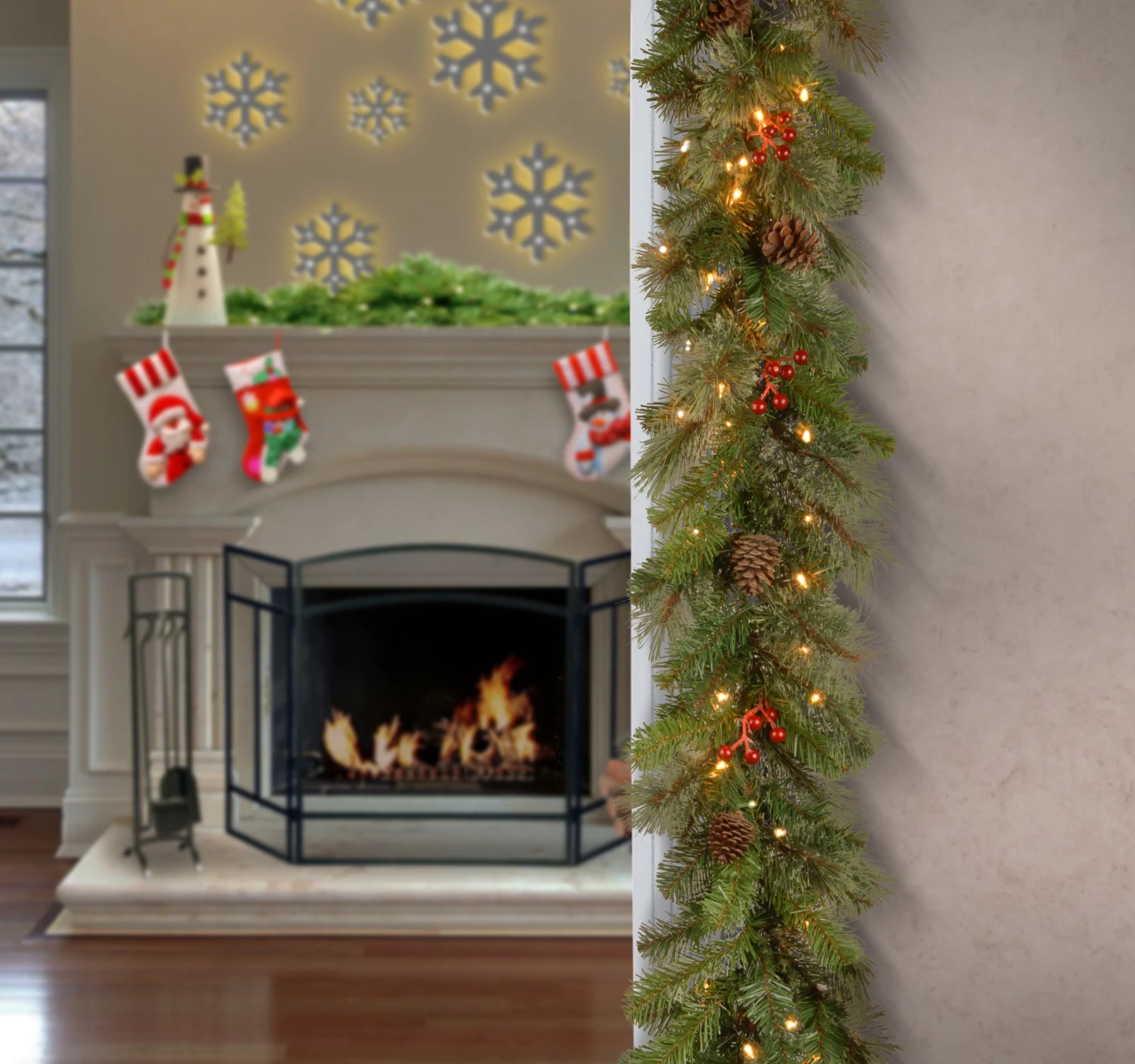 Transform your home for the winter holidays with National Tree Company’s Pre-Lit Artificial Christmas Garland. Designed with a Cashmere Berry branch base, this garland is 9 feet long and decorated with pine cones and berry clusters. These beautifully ornate decorations complement the garlanda???s natural looking branches. Made to look and feel lifelike, the stunning realism of the tree is defined by its close attention to detail, featuring tens of individually crafted branch tips that create a full bodied garland. This fantastically festive garland is strung with white UL lights prior to packaging for a more convenient setup. The lights operate individually, so if the bulb lens has not been cracked or broken, the light set will continue to illuminate except for any individual bulbs that are not working. To power the lights, simply plug them into the nearest outlet and let the pre strung lights illuminate your home with the warmth and cheer of the holiday season. Hang this decorative garland over any door, window or mantle to bring a Christmas ambience into any room or covered porch. Constructed with sturdy, high quality materials and hypo-allergenic, fire-resistant needles, this tree is built to bring holiday cheer for years to come. This hanging decoration is suitable for both indoor and covered outdoor use. At National Tree Company, we strive to create high quality Christmas decorations to help you transform your home so you can keep making every holiday moment magical.
