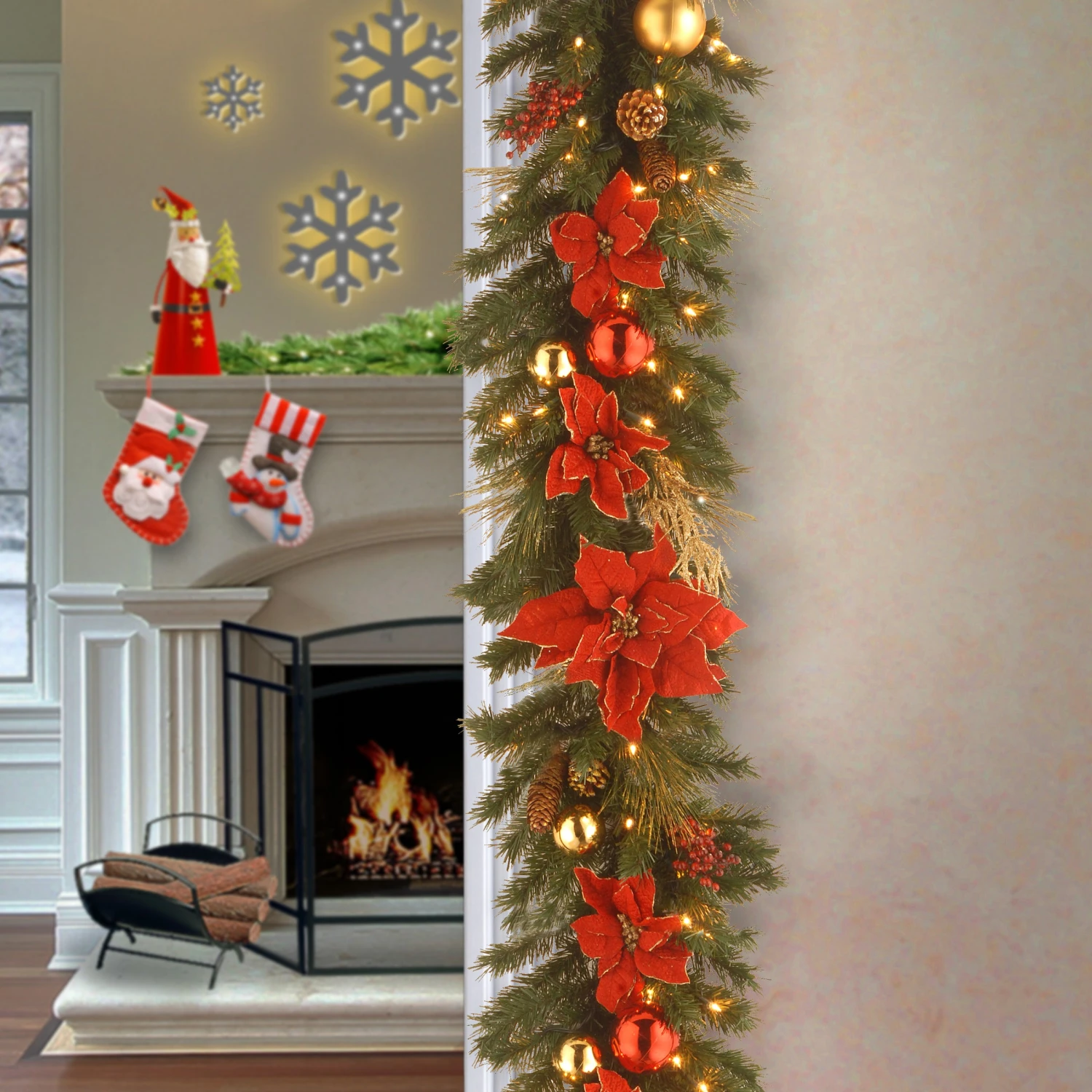 - Designed with an Evergreen branch base, this pre-lit artificial Christmas garland is 9 feet long and decorated with pine cones, golden branches, ball ornaments and poinsettia flowers.