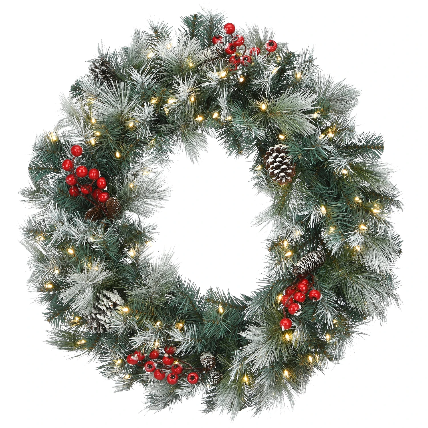 - Designed with a Snowy Glacier Pine branch base, this pre-lit artificial Christmas wreath is 30 inches wide and decorated with pine cones, berry clusters and frosted branches.