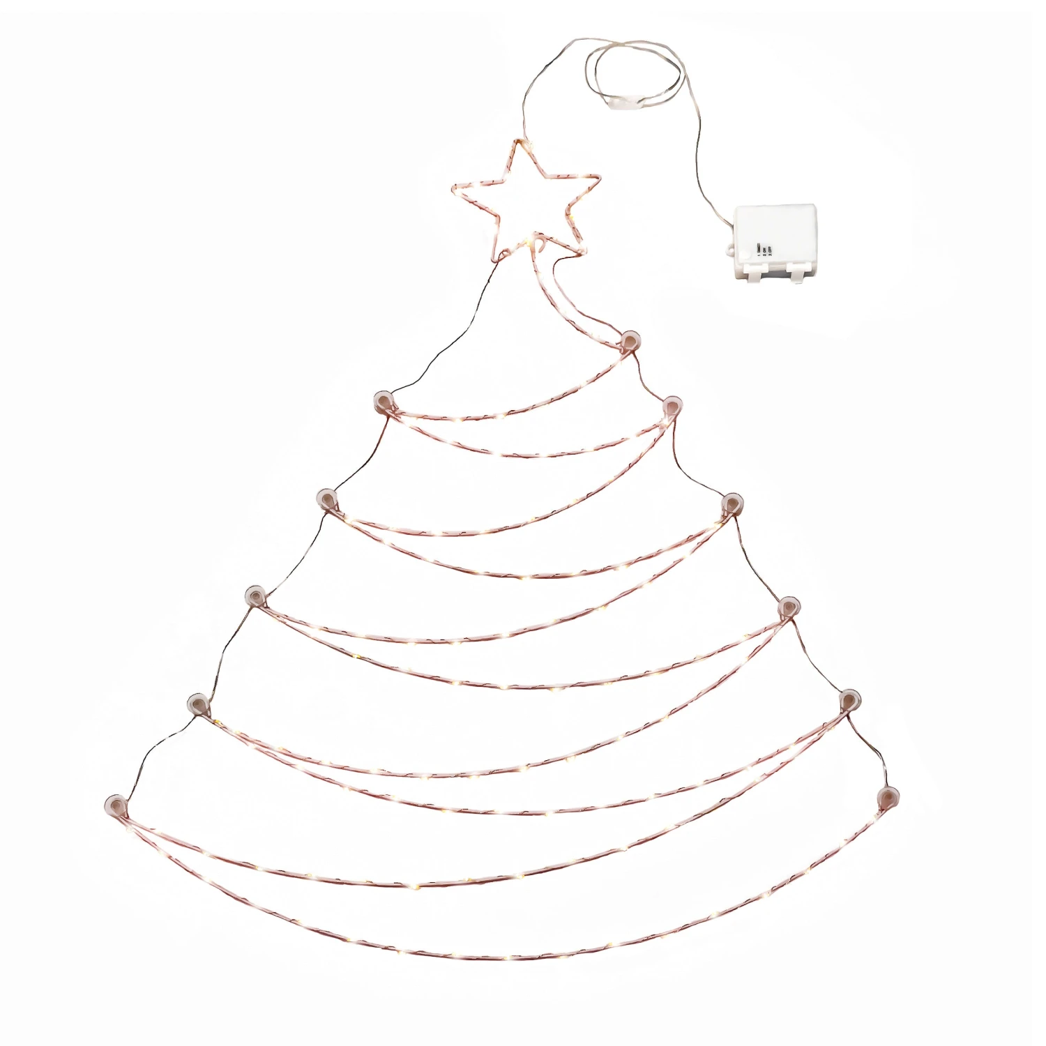 This unique holiday decoration is constructed with flexible metal wire components that when unfolded stretch down to form a star topped Christmas tree. The entire piece is wrapped in a total of 117 warm white LED rice lights that create a soft glow and hi