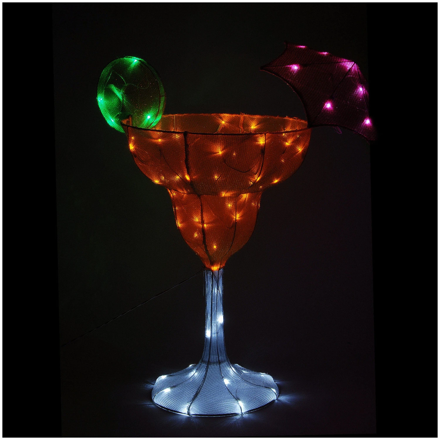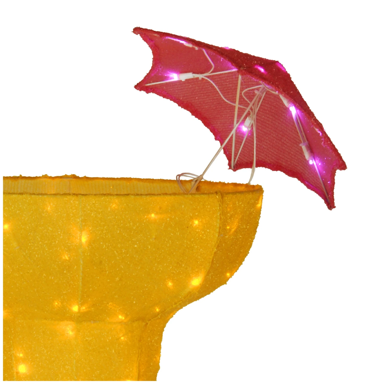 - Includes one Pre-Lit Margarita Glass Outdoor Decoration that measures 36 inches in height and 31 inches in width and features yellow and white tinseled fabric for the glass, pink for the decorative umbrella and green for the slice of lime.