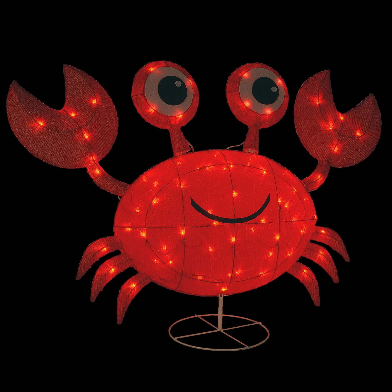 - Includes one Pre-Lit Smiling Red Crab Outdoor Decoration that measures 32 inches in height and 48 inches in width and features red and white tinseled fabric.