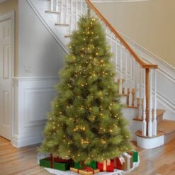 Pre-Lit Artificial Full Christmas Tree, White, Dunhill Fir, White Lights, Includes Stand, 7.5 Feet